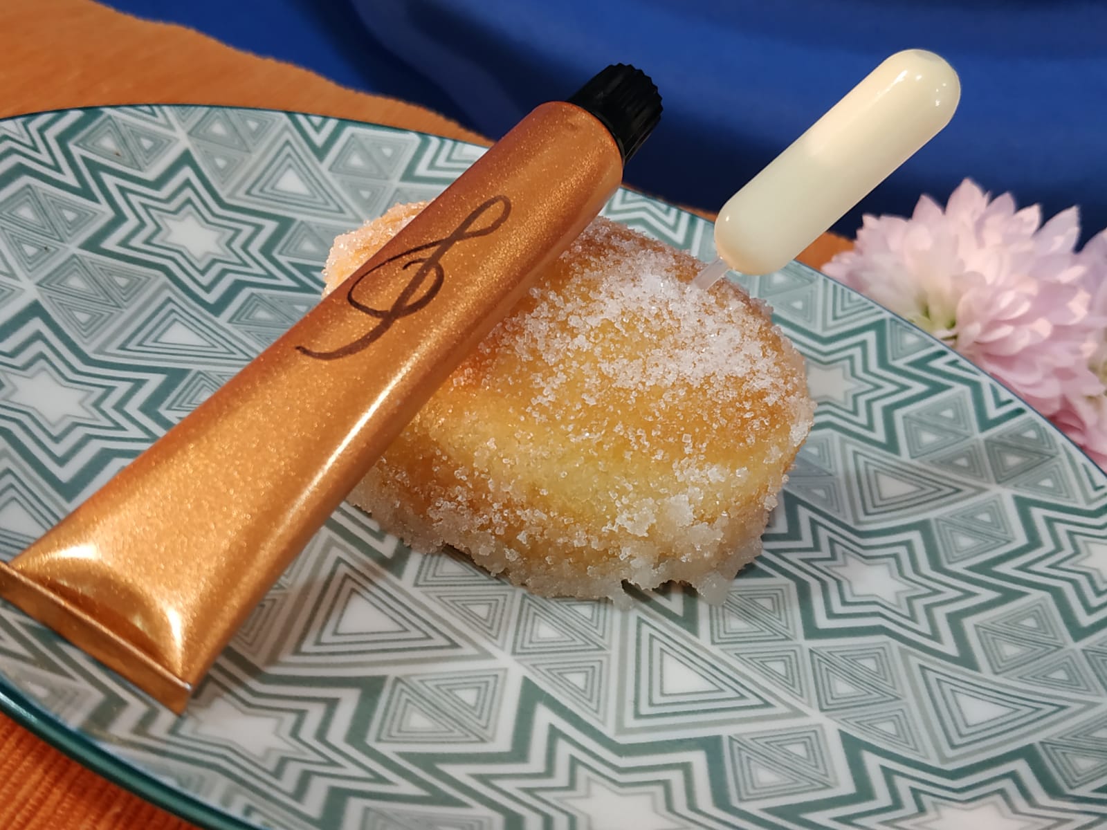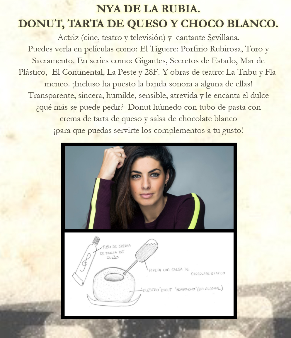 Nya de la Rubia: Donut, Tarta de Queso y Choco Blanco.Donut húmedo con tubo de pasta con Crema de Tarta de Queso y Salsa de Chocolate Blanco.