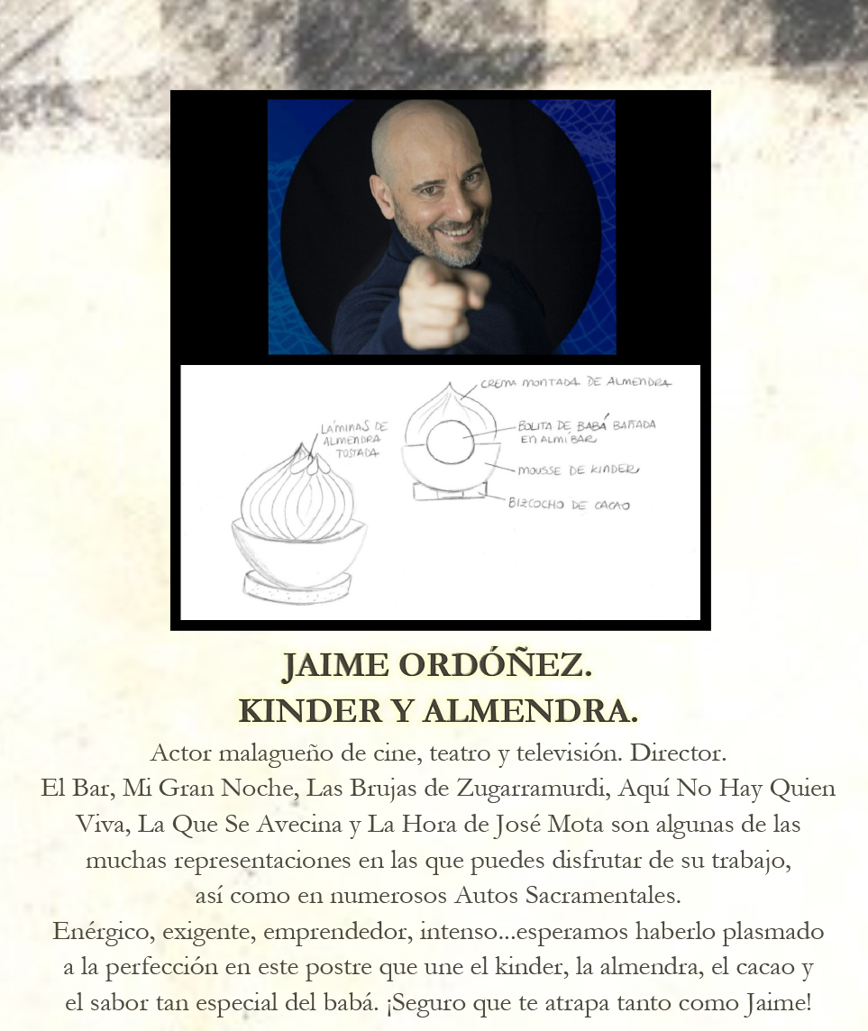 Jaime Ordóñez: Kinder y Almendra. Este postre une el Kinder, la Almendra, el Cacao y el sabor tan especial del Babá