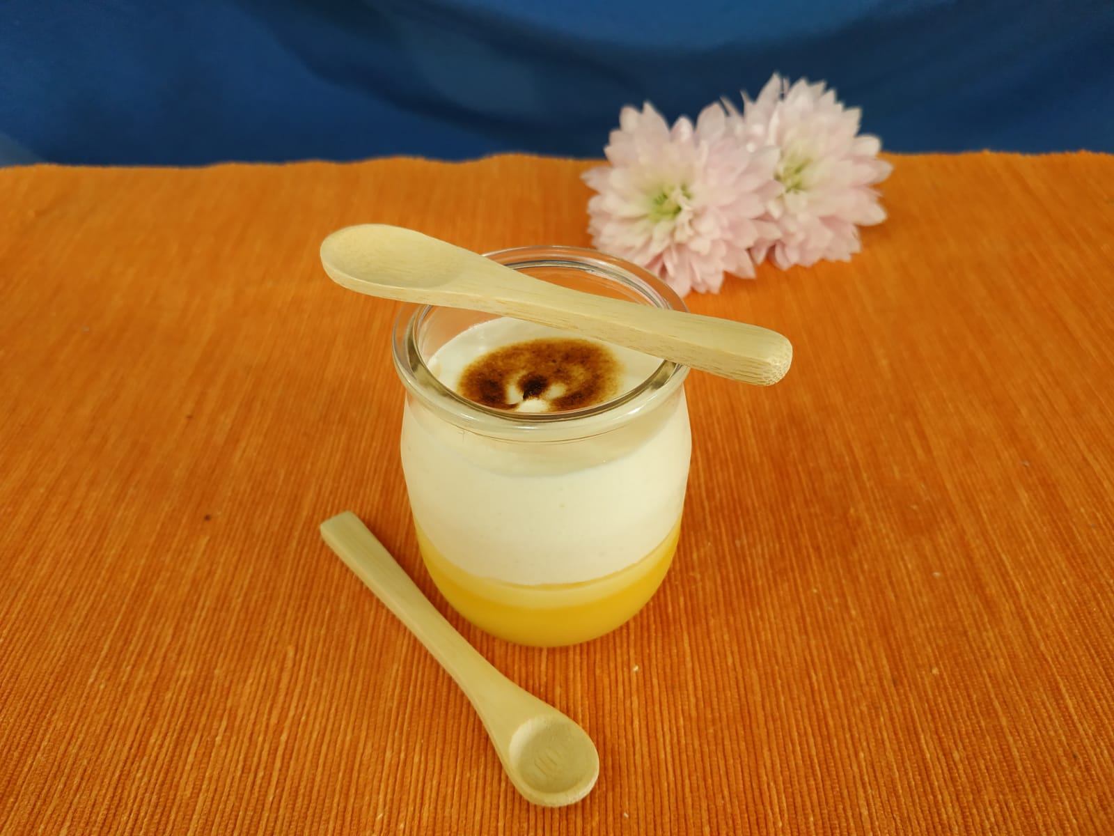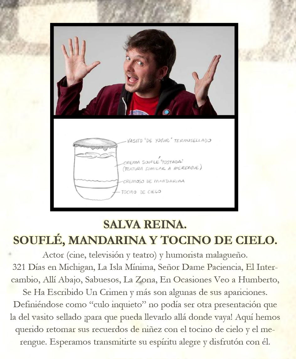Salva Reina: Souflé, Mandarina y Tocino de Cielo.Presentación en vasito para llevar donde quieras, con Tocino de Cielo y Merengue.