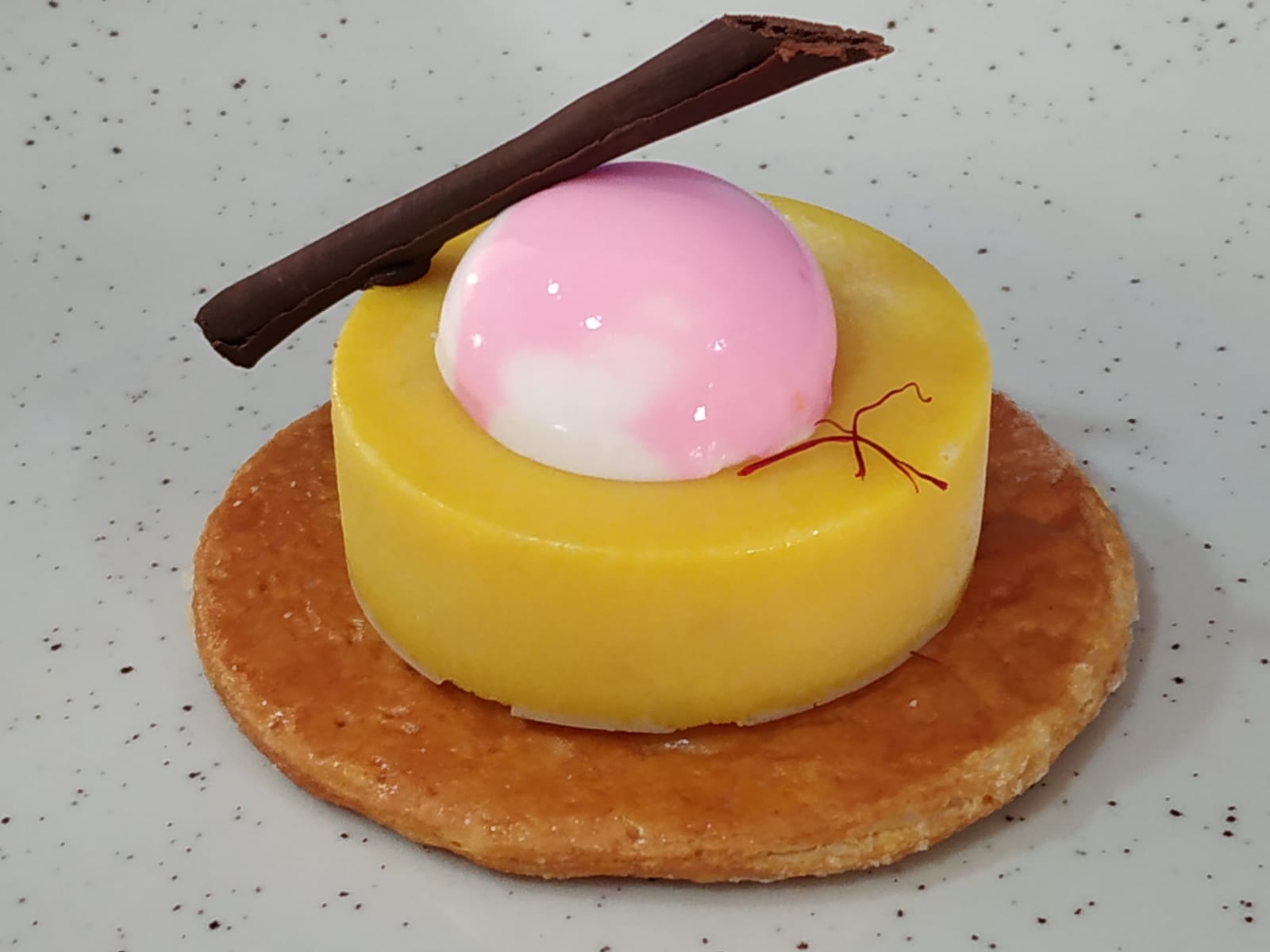 Aitor Luna: Plátano, Mango, Azafrán y Yogur. Cremoso de Mango y Plátano con Azafrán, base de Hojaldre caramelizado, Panna Cotta de Yogur y un toque de Chocolate.