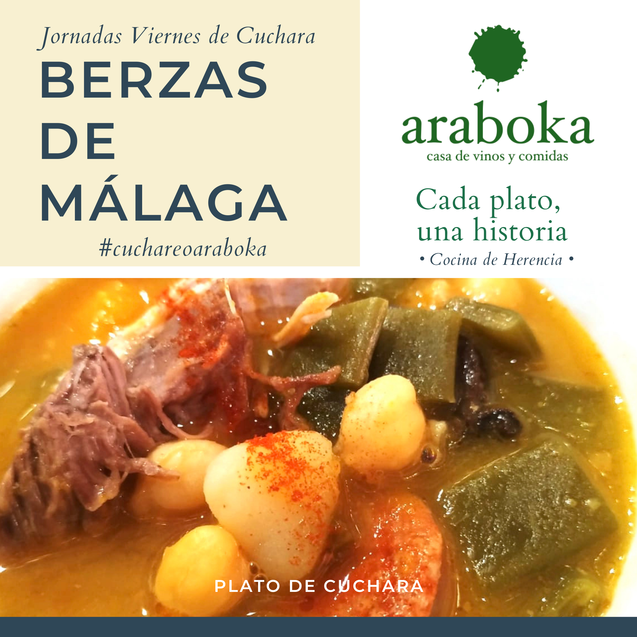 La variedad es muy grande, comenzando por las típicas Berzas Malagueñas con las que damos la bienvenida al mes de octubre. Seguimos con los Callos con Garbanzos. Potajes, con legumbres y las verduras de temporada: Berza de Coles, de Judías verdes con Calabaza,  Tagarninas de la zona de Villanueva del Rosario, etc.; en  época más invernal incluían las carnes de la matanzas: pringás de cerdo con morcilla y chorizo. Los arroces también se incluyen en estas Jornadas de Cuchareo Araboka Guisos de Cuchara Marinera: Papas con Jibia en amarillo, Papas con Choco, Cazuela de fideos con boquerones, …